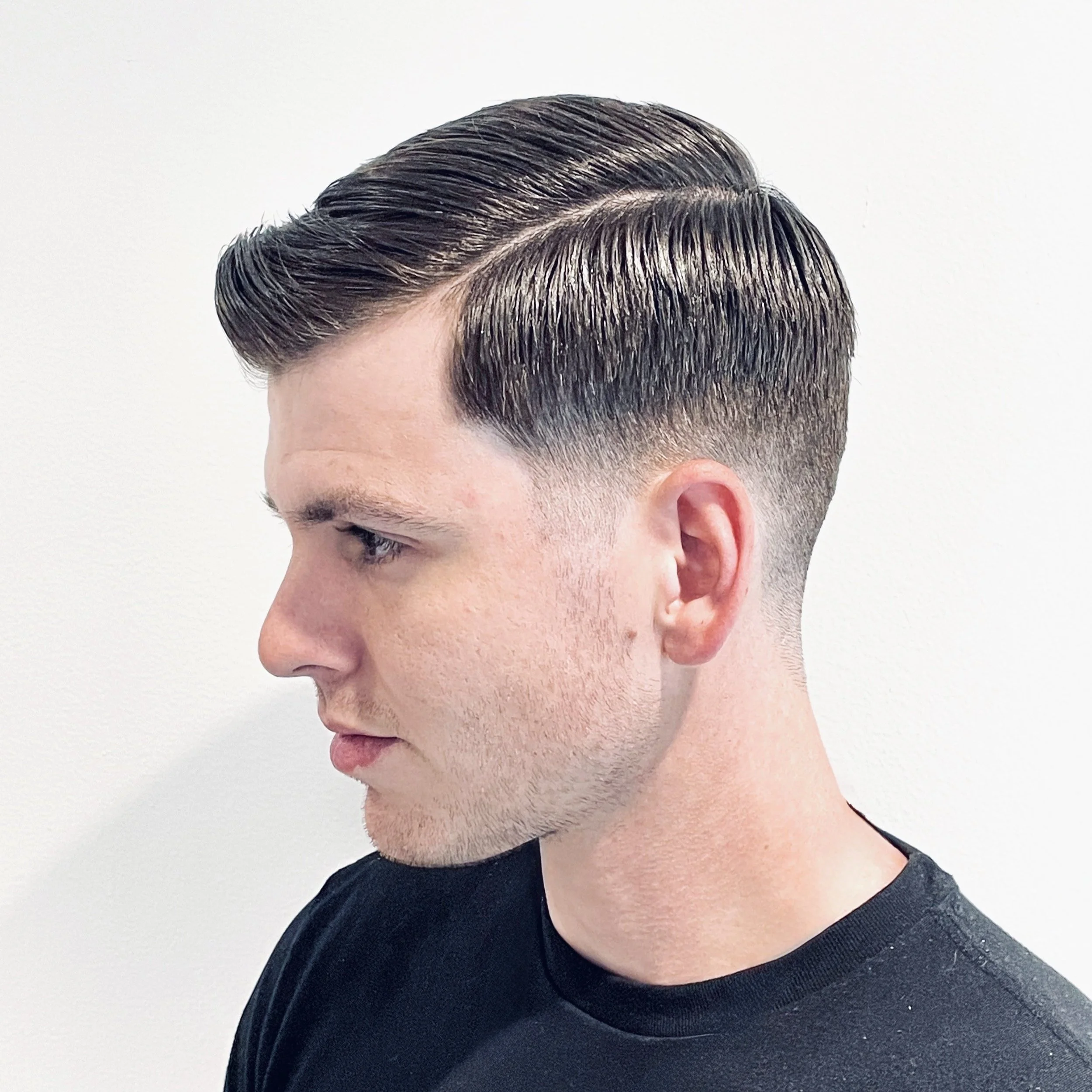 Haircut in which the hairline is no longer observed and the fade is achieved with scissors/clippers and the use of an electric shaver. Includes hot towel straight razor neck shave.